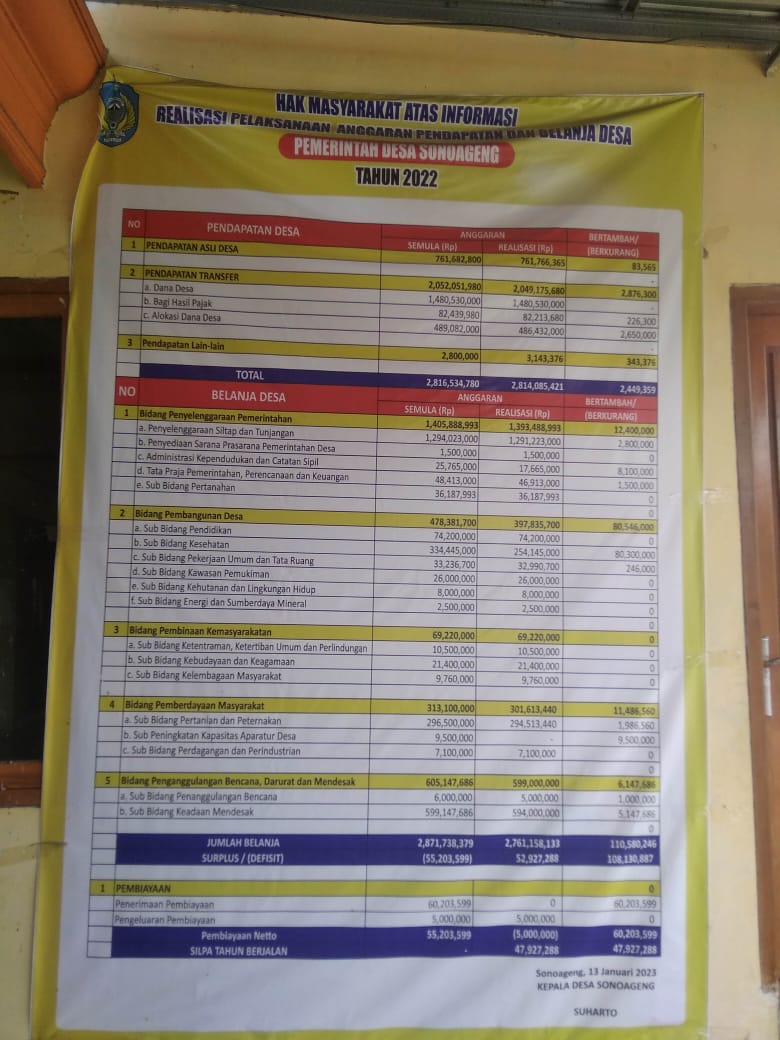 Informasi Realisasi Anggaran APBDes Sonoageng tahun 2022